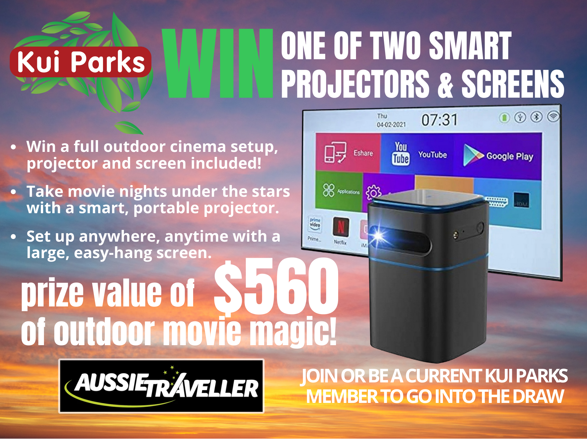 This month Aussie Traveller is giving away a smart projector & screen set to Two Kui Parks Members!