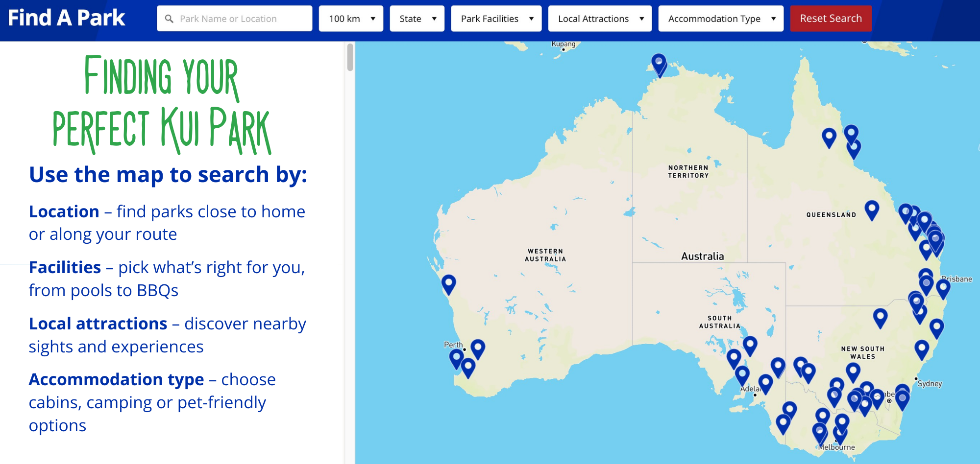 Through the Kui Parks website, travellers can quickly locate parks across Australia, search by state or narrow things down using features that matter to them. Whether you’re travelling with a large rig, bringing your pet along, or looking for parks near certain activities, the search tools help you find a park that suits your journey.